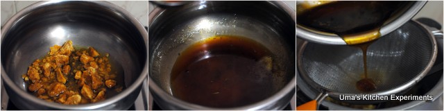 6) Filter the dissolved jaggery water to remove impurities. Add this to the mashed moong dal. Mix well.